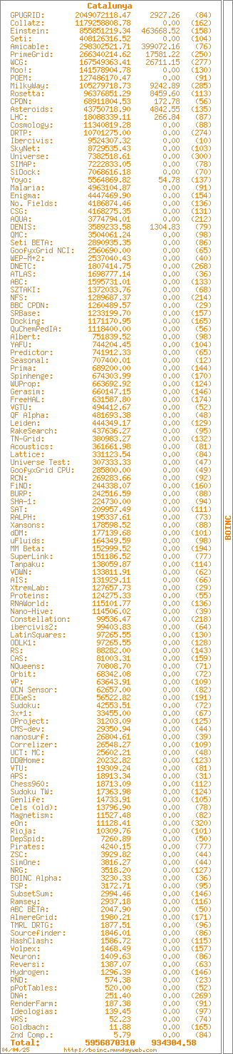 Soc voluntari en computació distribuïda, primer participant en SETI@home a finals dels anys 90, i després en la plataforma BOINC (Berkeley Open Infrastructure for Network Computing) que el va absorbir. Això és el que he fet fins ara: